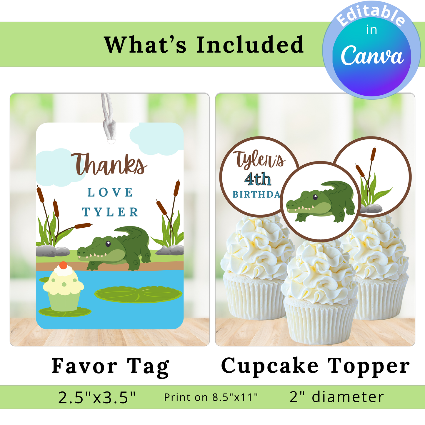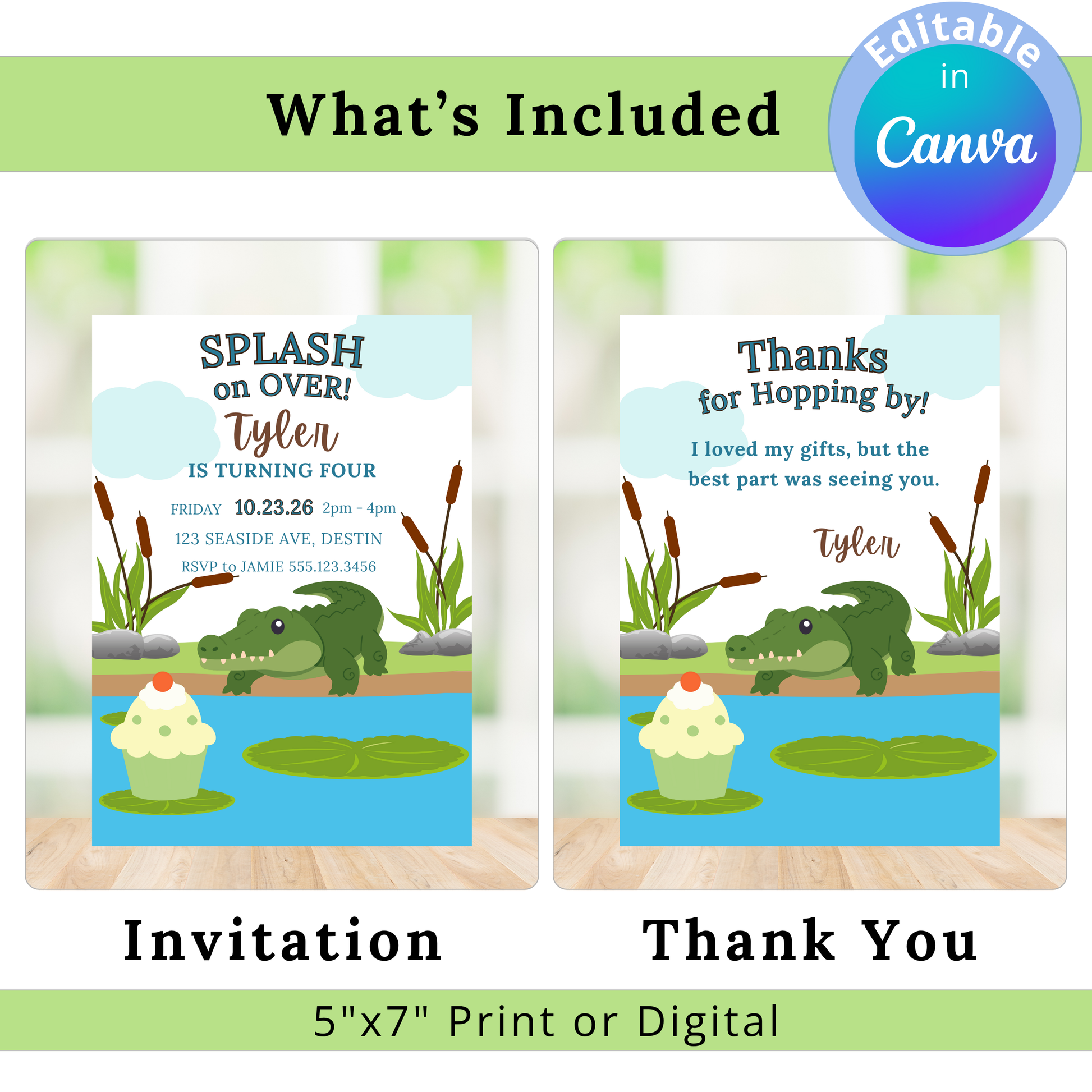 The Alligator Party Bundle includes everything you need to bring your celebration to life—editable templates for invitations, thank-you cards, favor tags, party signs, and more. With easy-to-use Canva links delivered in a handy PDF, customizing and printing your designs is a breeze. Make a splash and celebrate with style by the cattail pond!