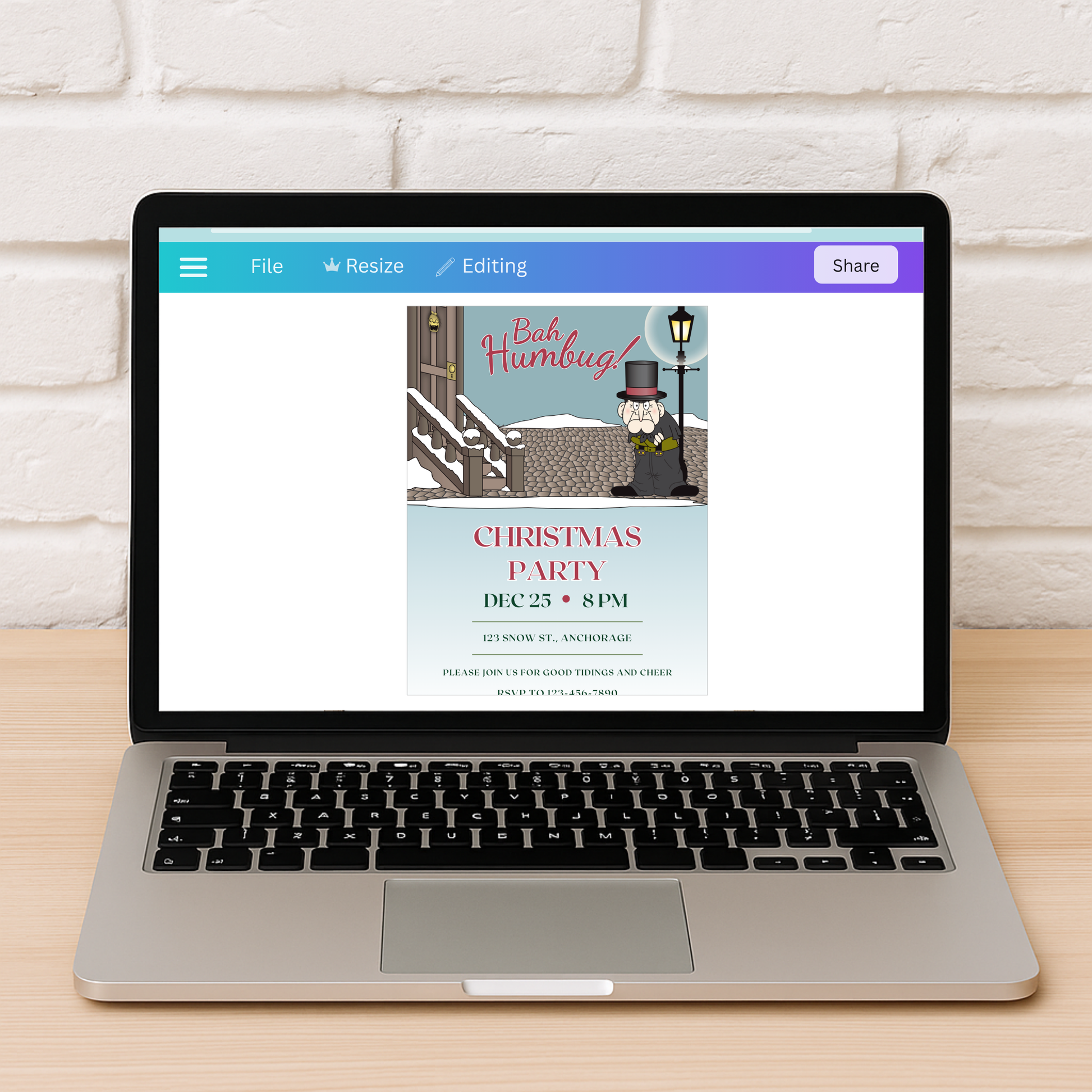 Featuring original art inspired by A Christmas Carol, this design showcases a cranky old man scowling beside a snowy lamppost — the perfect tongue-in-cheek invite for office parties, family gatherings, or Christmas get-togethers with a sense of humor.